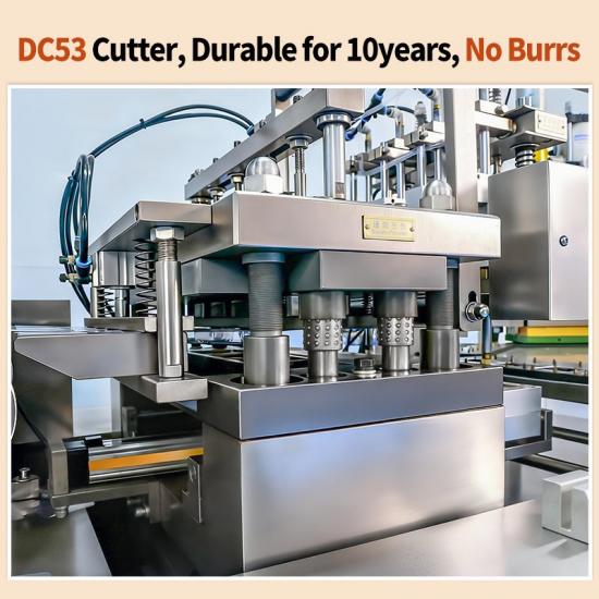 Filem lepuh dengan rongga yang terbentuk kemudiannya dimasukkan ke dalam stesen penebuk, di mana acuan ketepatan memotong filem menjadi unit lepuh individu. Proses penebuk disegerakkan dengan daya tarikan motor servo, memastikan tepi yang bersih dan bebas gerigi pada setiap lepuh.