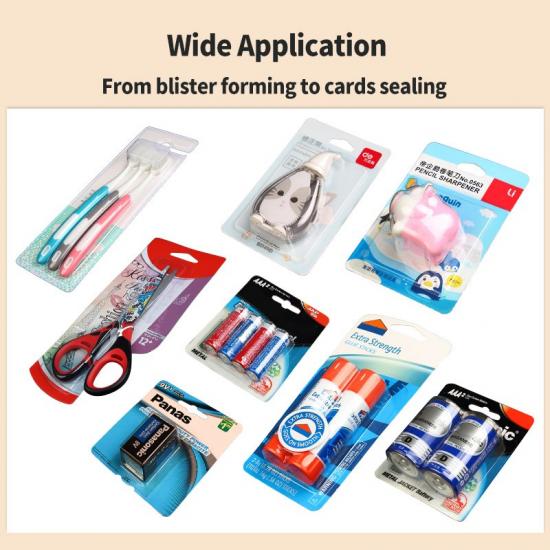 Sesuai untuk pembungkusan perkakasan kecil (skru, nat, bolt), alat tulis (pin, staples), dan keperluan harian (span kosmetik, peralatan kecil). Acuan mesin yang boleh disesuaikan membolehkan pembungkusan produk yang berbentuk tidak sekata, manakala meterai kad lepuh yang ketat menghalang kehilangan atau penyebaran barang kecil, sekali gus meningkatkan kecekapan pembungkusan dan persembahan produk.