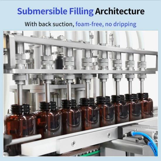 Pengisian selam bawah adalah salah satu ciri utamanya. Semasa proses pengisian, kepala pengisian sentiasa disimpan di bawah paras cecair. Reka bentuk ini bijak menyelesaikan masalah cecair berbuih dan percikan. Bagi sesetengah cecair yang mudah berbuih, seperti cecair yang mengandungi surfaktan dan cecair oral tertentu, kaedah pengisian tradisional mudah diisi di atas paras cecair, menyebabkan sentuhan ganas antara cecair dan udara, mengakibatkan sejumlah besar buih. Gelembung ini bukan sahaja menduduki ruang bekas, menjejaskan ketepatan isipadu pengisian, tetapi juga boleh melimpahi bekas, menyebabkan sisa cecair dan pencemaran peralatan. Walau bagaimanapun, dengan pengisian selam bawah, memandangkan kepala isian masuk jauh di bawah paras cecair, cecair boleh disuntik dengan lancar ke dalam bekas, mengurangkan sentuhan dengan udara, dan secara asasnya menghalang penjanaan buih. Pada masa yang sama, ia juga mengelakkan cecair terpercik keluar dari bekas akibat hentaman, seterusnya mengurangkan kehilangan cecair.